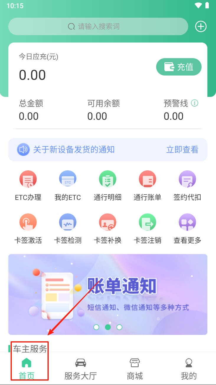2、查看车主服务:在首页点击“车主服务”图标,查看并管理您的ETC和通行账单。