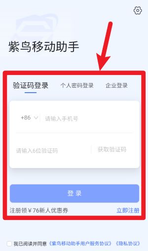 1、打开紫鸟移动助手APP后,用户可选择验证码登录、密码登录或企业登录三种方式安全进入系统。