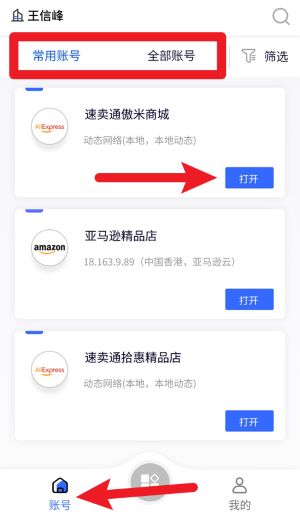 2、点击底部“账号”选项卡,即可快速浏览常用账号与全部账号,并支持一键进入目标店铺管理界面。