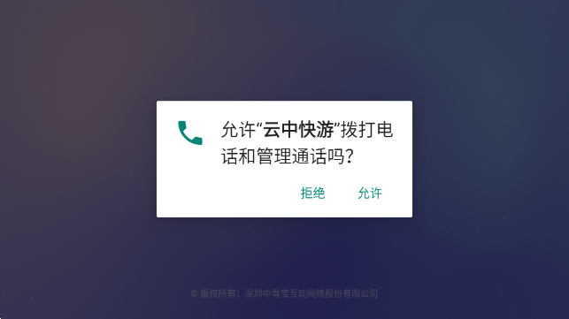 2:接下来会弹出权限请求窗口,询问是否允许“云中快游”拨打电话和管理通话,根据个人需求选择“拒绝”或“允许”以完成权限设置。