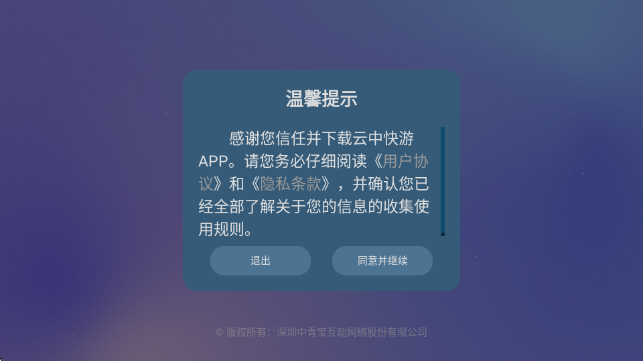 1:打开云中快游APP后,首先会显示温馨提示界面,需仔细阅读《用户协议》和《隐私条款》,了解信息收集使用规则,确认后点击“同意并继续”进入下一步。