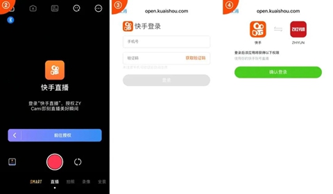 2、依次点击「快手直播」-「前往授权」按钮,将自动跳转至快手APP或快手登录页面(手机未下载快手APP情况),登陆快手账号后点击「确认登录」授权即可。