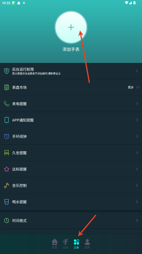 1.打开后台蓝牙,点击设备内的添加手表+。