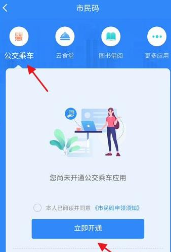 5、进入市民码,找到点击上方的公交乘车,点击下方的立即开通完成即可