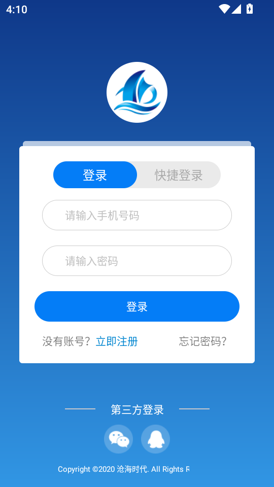 2.登录界面设账号密码输入框蓝色登录按钮醒目,下方立即注册入口方便新用户,还可切换快捷登录,需填写信息完成身份验证开启平台使用。