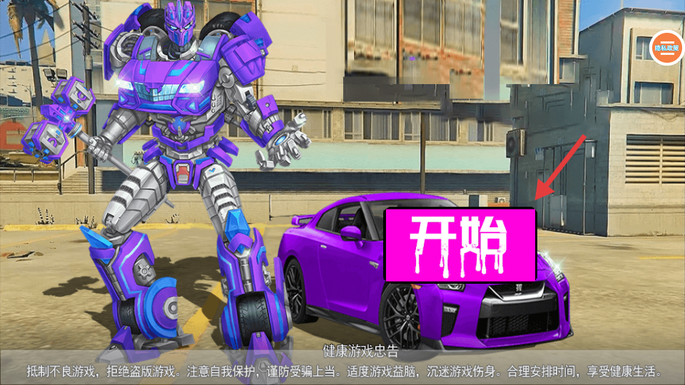 1.点击【开始】,操控紫色机甲或汽车,开启城市冒险,体验变形战斗玩法。