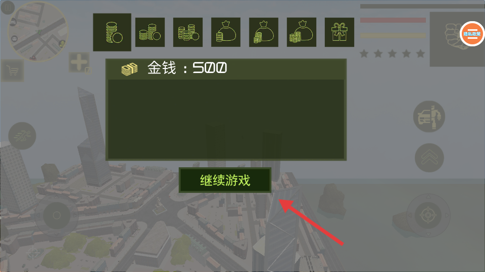 3.确认【金钱-500】,点击【继续游戏】,进入城市场景规划资源运用。