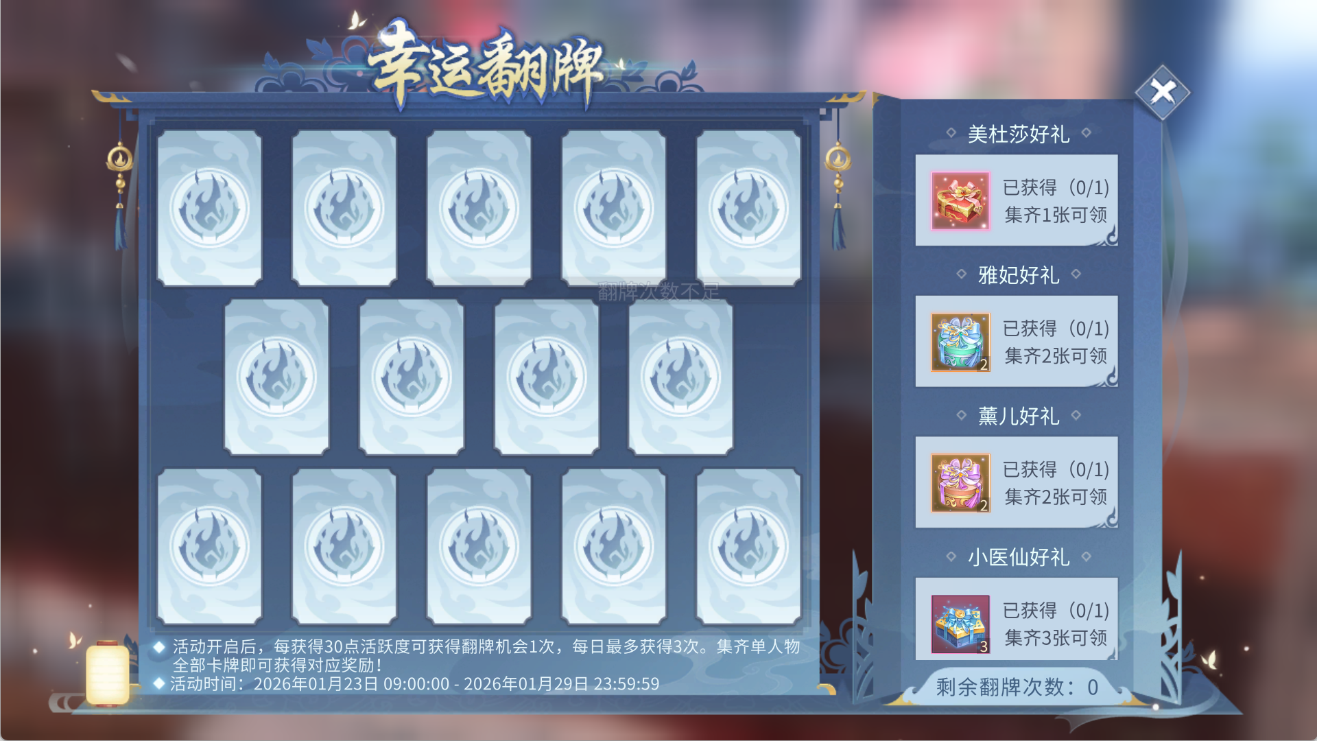 2)每获得30点活跃度可获得翻牌机会1次,每日最多获得3次。集齐单人物全部卡牌即可获得对应奖励。