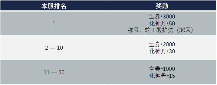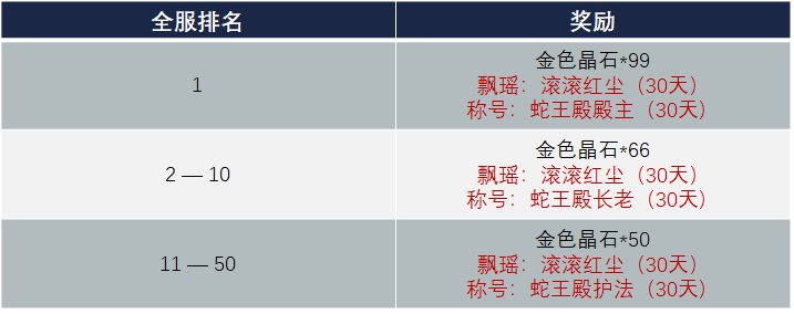 1)活动期间内参与蛇王殿可以累积胜场,登上全服或本服排行榜,活动结束时可以领取对应奖励,奖励将于活动结束后邮件进行发放。