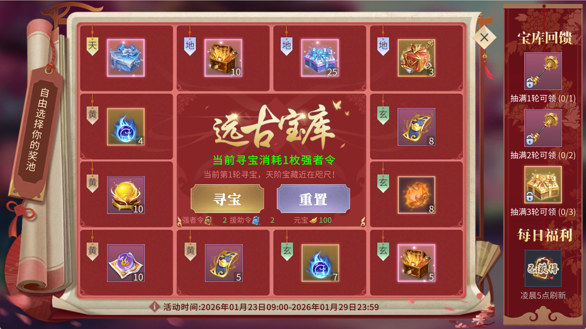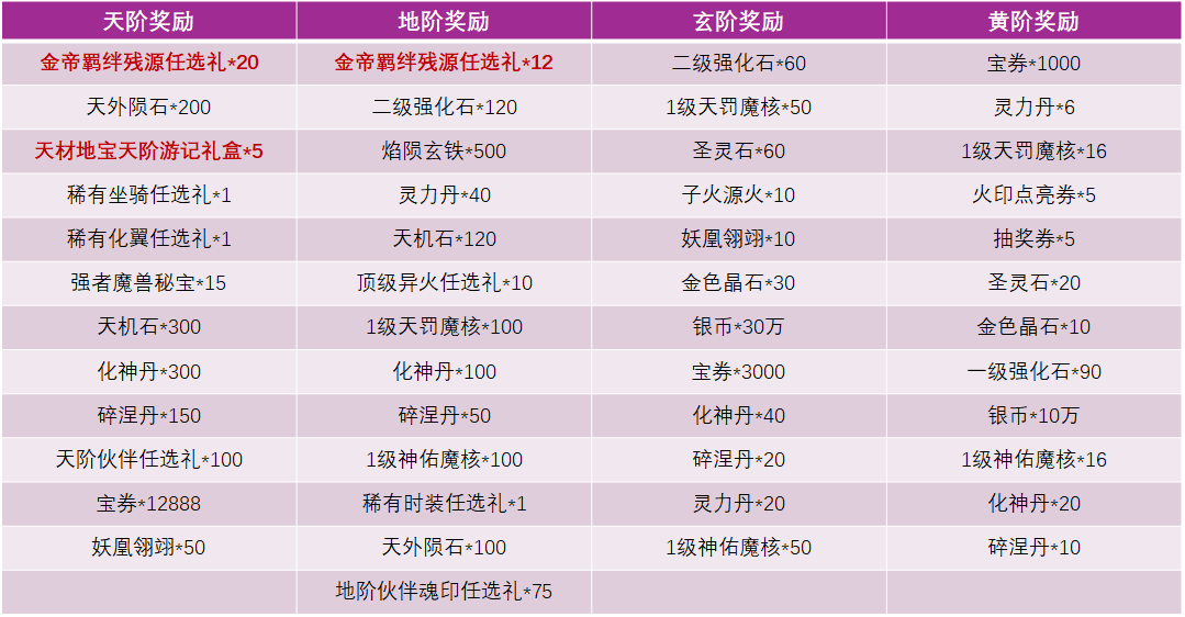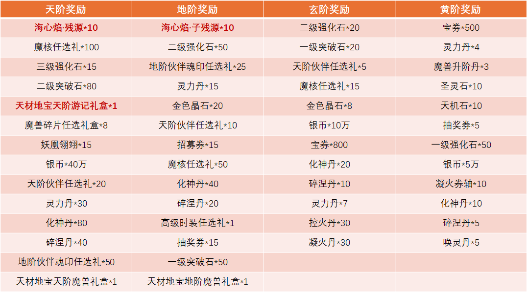 2、寻宝开始之前,斗者可分别选择自己心仪的天、地、玄、黄阶奖励,其中天阶可选1种,地阶可选3,玄阶可选4种,黄阶可选4种。