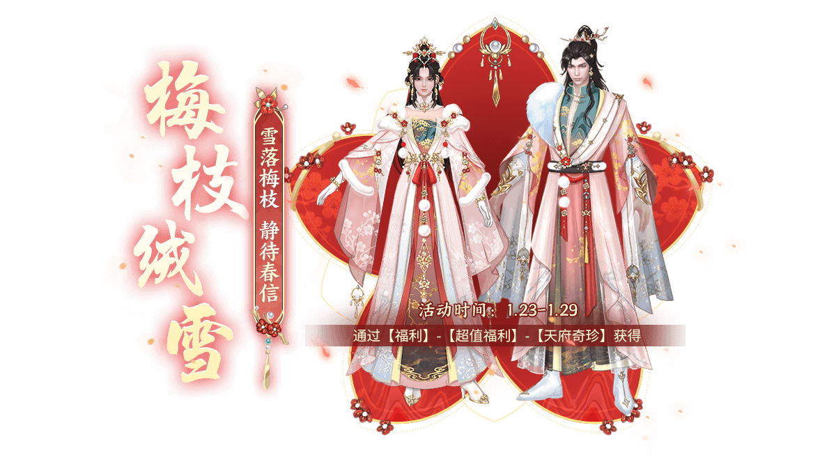 特别说明:本套华裳七件套为梅枝绒雪·服饰、梅枝绒雪·发饰、绛雪藏春头像三件套、称号”凌雪寒梅立云阶”、化翼“冰霜云羽”。
