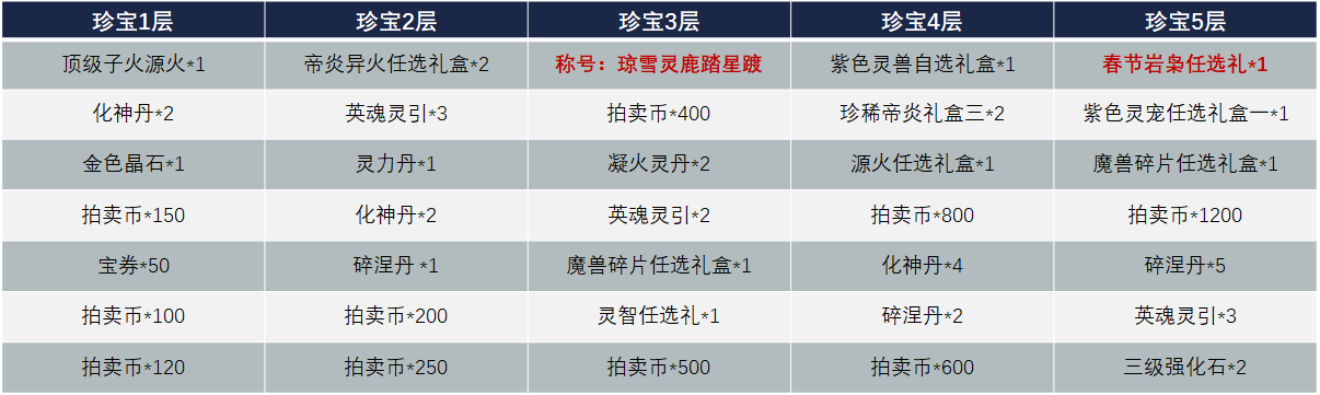 1、活动共有五层奖池,每层有7个固定奖励,其中1个珍宝奖励,6个普通奖励。斗者可以查看未解锁的各层奖励。