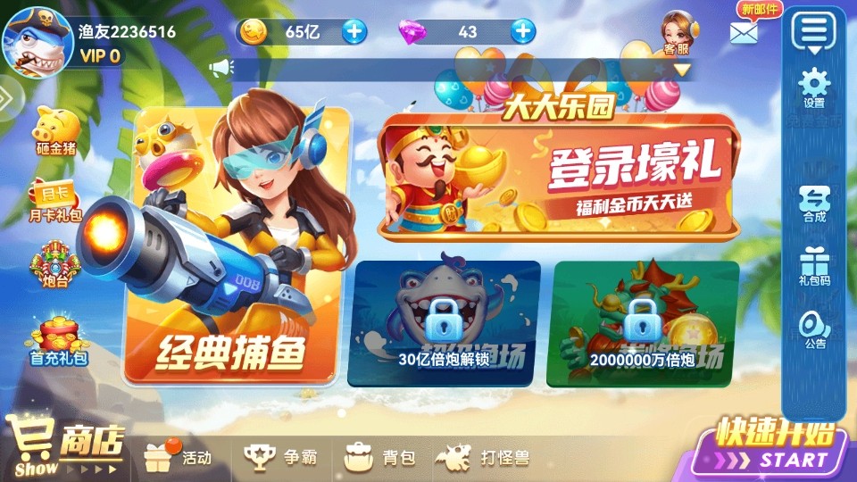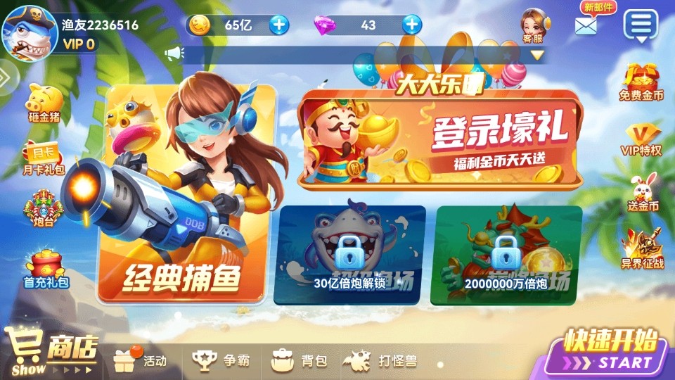 击杀鱼种是获取金币的主要途径,玩家通过捕捉各类鱼种来获取大量金币,随着炮台的升级,消耗的金币会随之上涨,但是击杀鱼种获取的金币也是成倍疯涨,炮台倍数越高,击杀金币越高,让你轻松拥有百亿金币。