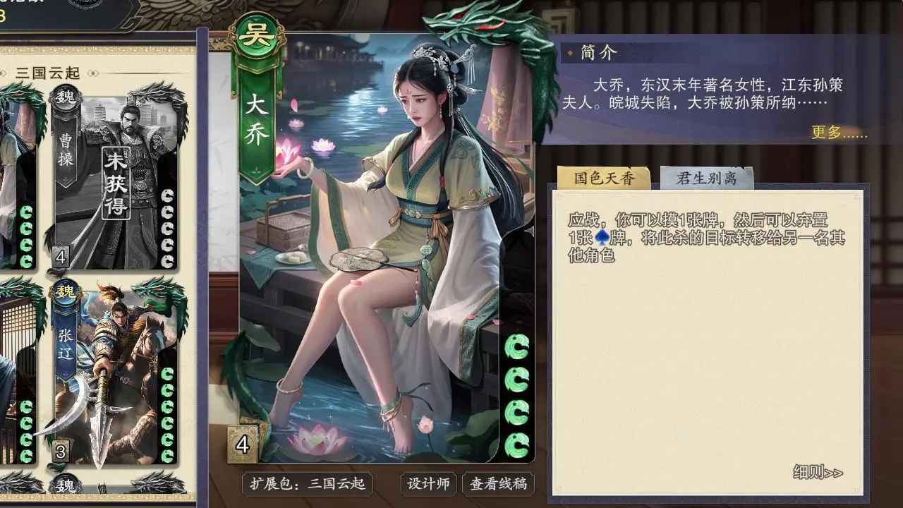 ②对大乔使用火杀,大乔发动技能“国色天香”将杀转移至曹操为目标,获胜。