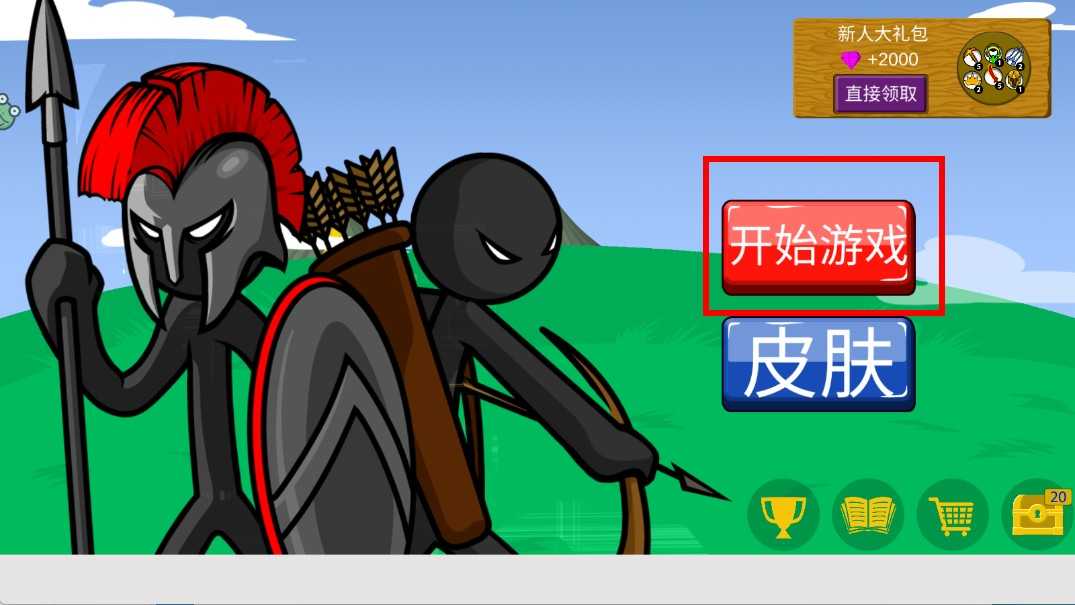 1.进入游戏界面,能看到持矛和弓箭的火柴人形象,点击开始游戏,即可开启火柴人战斗冒险,进入精彩的对战世界。