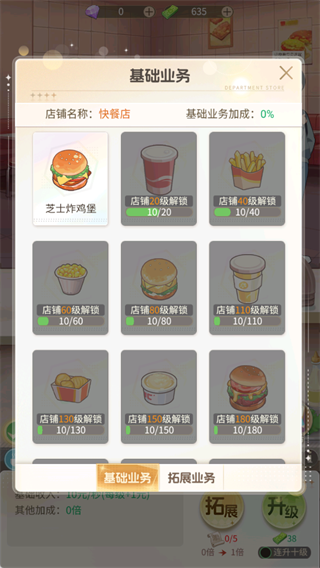 2、餐品拓展:优先升级快餐店等级,解锁基础业务中的新餐品,丰富品类吸引更多顾客,提升单次收益。