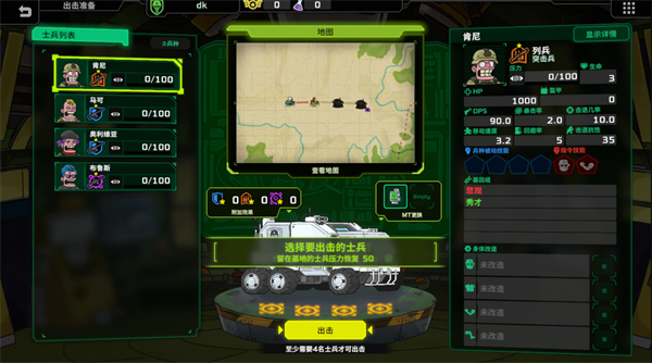 1、出战配置:每次出击务必凑齐4名士兵,避免前线兵力不足。根据任务地图的地形与敌人类型,灵活选择兵种组合,例如面对大量空中单位时,优先选择马可、奥利维亚这类对空能力强的兵种。