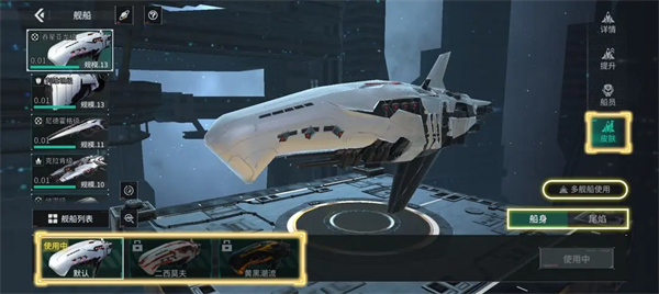 点击【舰船皮肤】页面可自定义舰船皮肤,皮肤分为船身和尾焰,点击多舰船使用可批量应用皮肤。