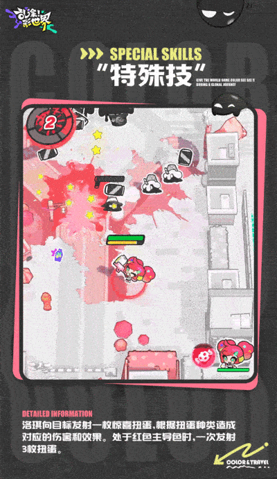 1、特殊技:洛琪向目标发射一枚惊喜扭蛋,根据扭蛋种类造成对应的伤害和效果。处于红色主导色时,一次发射3枚扭蛋。