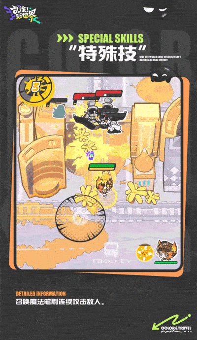 1、特殊技:召唤魔法笔刷连续攻击敌人。