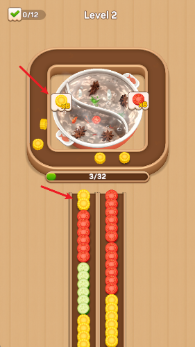 1、开始游戏后,点击食材即可围着火锅旋转,到达对应位置就会自动进入锅中。