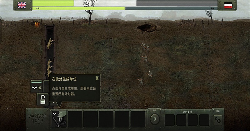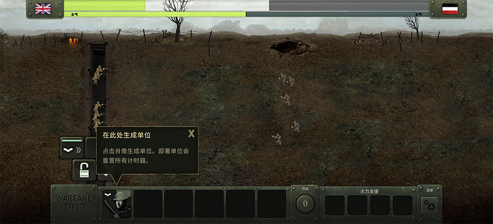 5、最后我们还能点击左下角的图案来操控小兵出战壕前压。