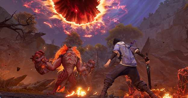 猩红神兽看似笨拙,但出招非常迅猛。不要贪伤害,注意观察它的举动,见势不妙走为上策!猩红神兽使用突进和抓投技能时,要注意观察它的移动方向,横向拉开距离,避免正面接招!