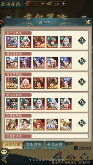 1、游戏一共有五种阵营武将可以选择,通过主城武将寻访获取,其中存在阵营克制机制,通过解锁图鉴可以领取元宝奖励。