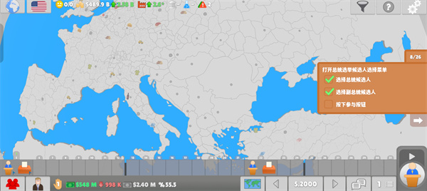 游戏构建了高度拟真的世界地图,涵盖主要国家、地区与核心城市,并完整整合选区体系。你可以通过筛选数据查看人口分布、外交关系、经济增长、军费比例、舆论走向及选举趋势等关键指标,同时支持二维地图视角,方便快速掌握整体局势。