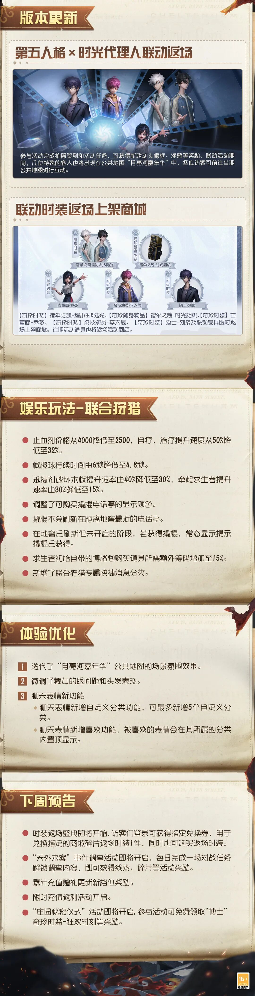 本周将采用不停服维护方式。7点30分服务器进入不停服维护状态,届时各位访客依旧可以体验大部分玩法和功能,包括但不限于:匹配、自定义、活动、推理之径等,商城的物品可以正常购买;