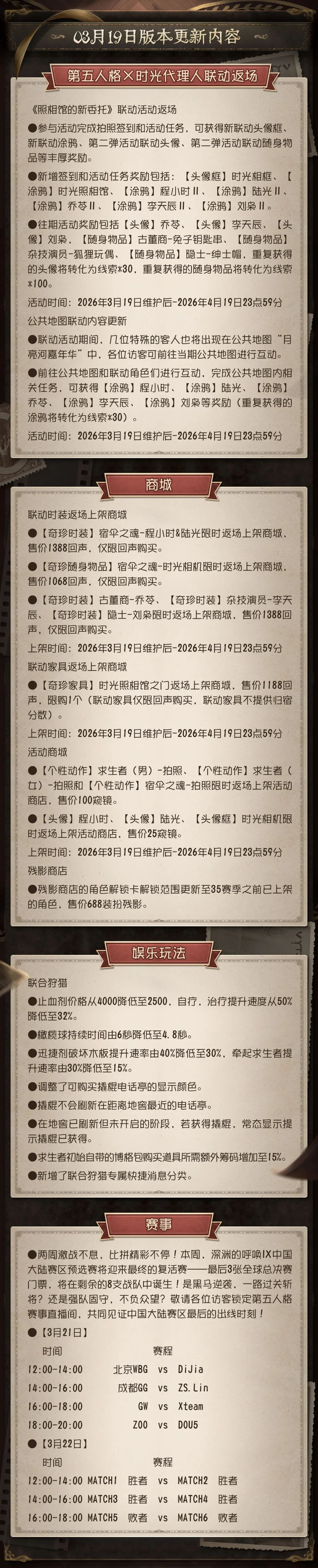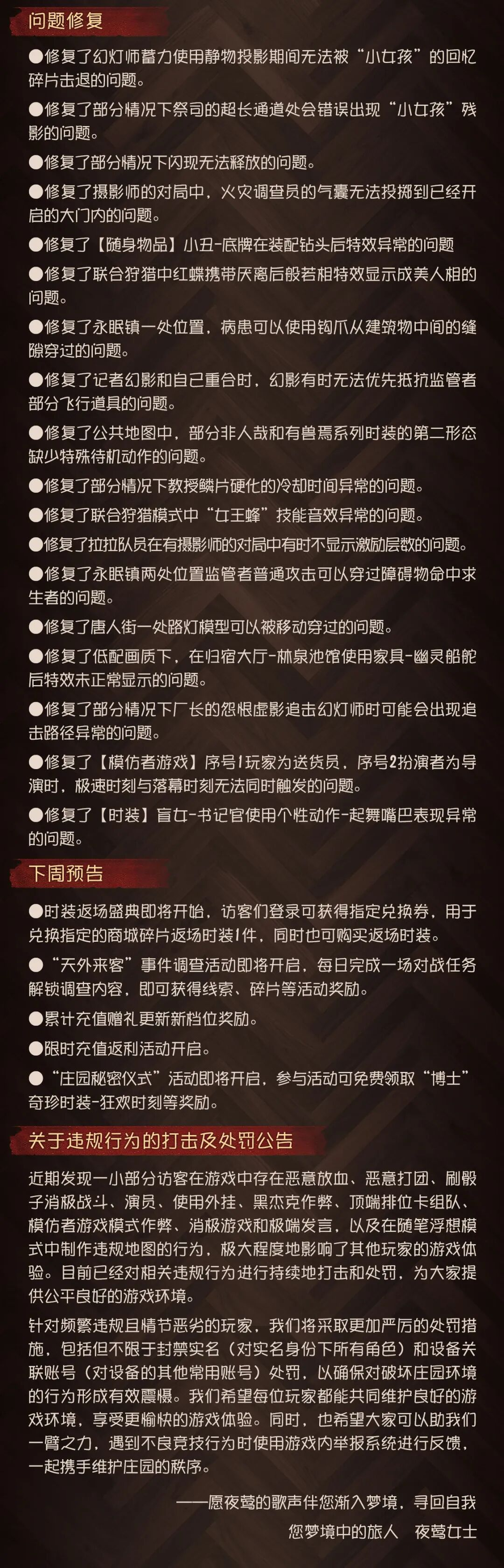 为保证庄园的稳定运行,【第五人格】将于周四上午07:30进行不停服维护。