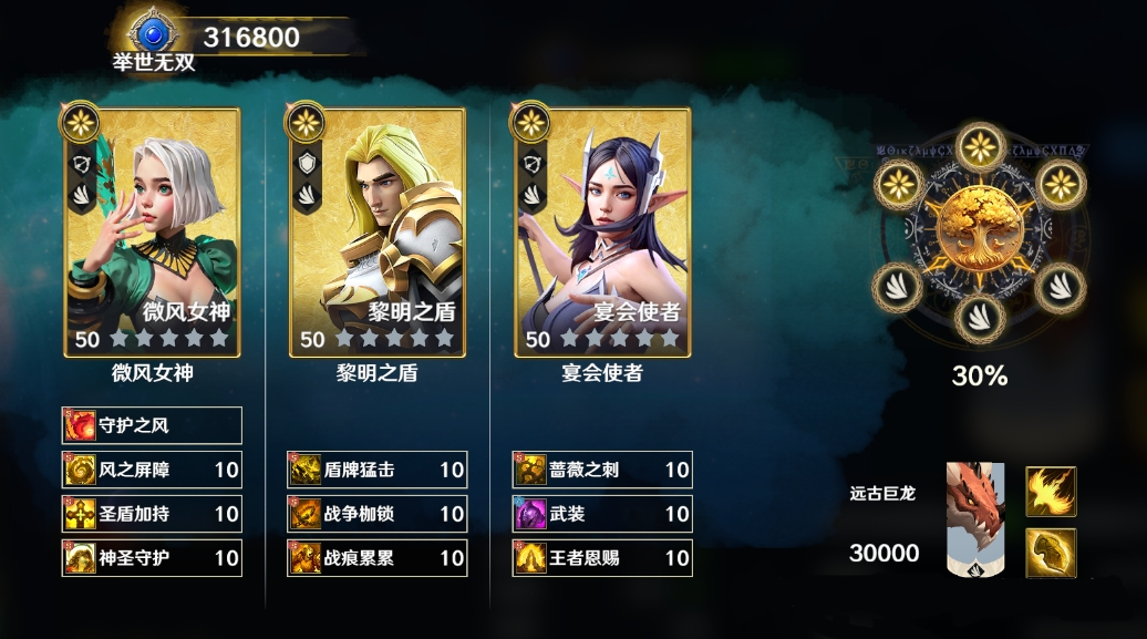 微风女神、黎明之盾、宴会使者:这套组合在前期非常强,微风女神的护盾和减伤能力可以保证队伍的续航,前排站住了后排才有输出。
