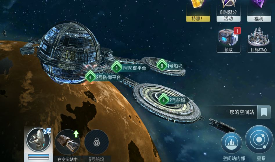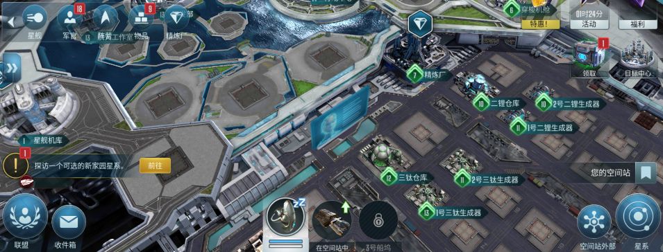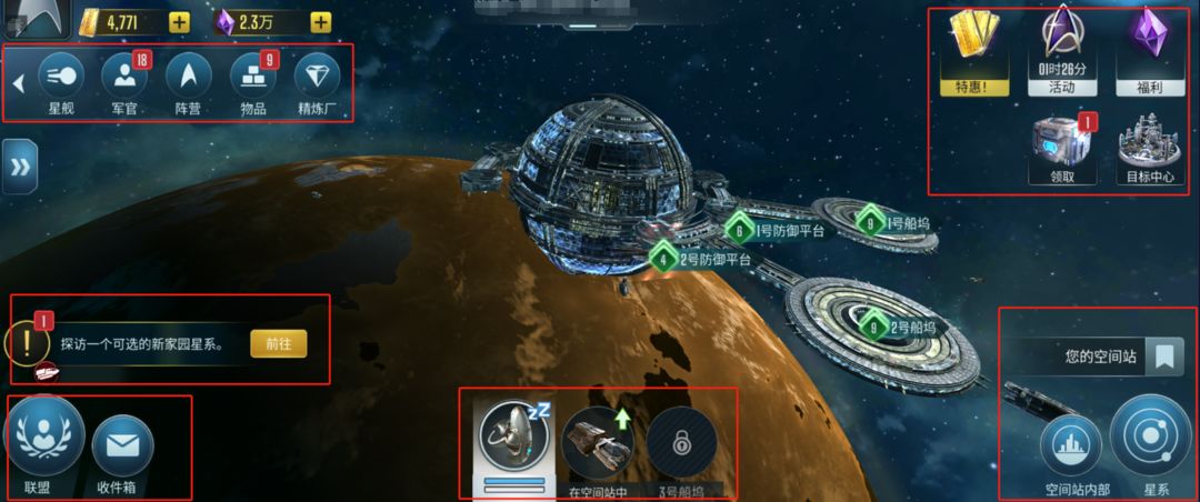 游戏界面看似复杂,不过比起来舰桥各大面板,应该算是简洁了。目前各个模块一目了然,大致分为主界面左侧的任务指引,左下角的联盟和邮箱,右上角的活动,宝箱及礼包,右下角则可以切换空间站/空间站外部和星系/银河系界面。比较不容易注意到的应该是正上方的聊天框,不过这种悬空近透明背景设计也确实能够给到点科技感。正下方则是星舰的管理区。