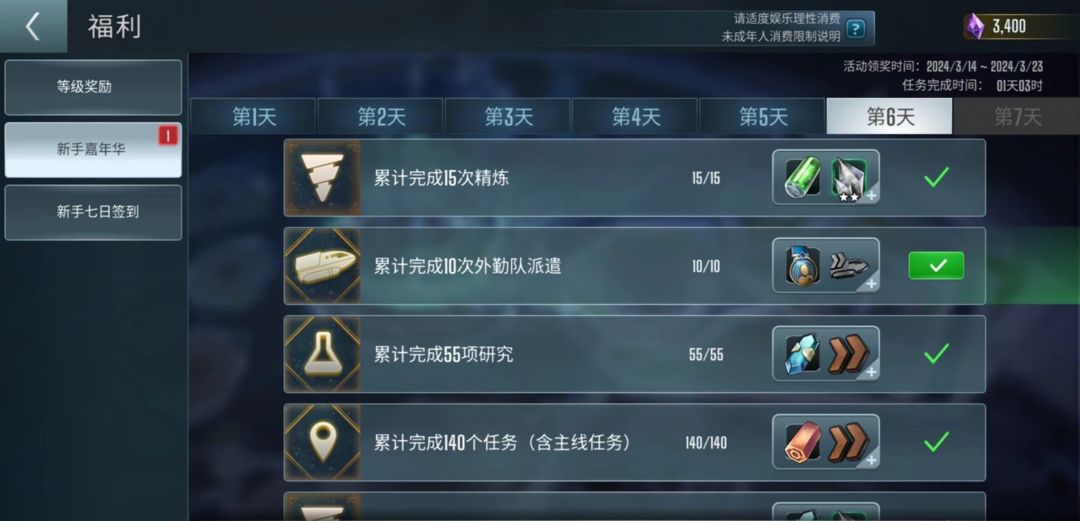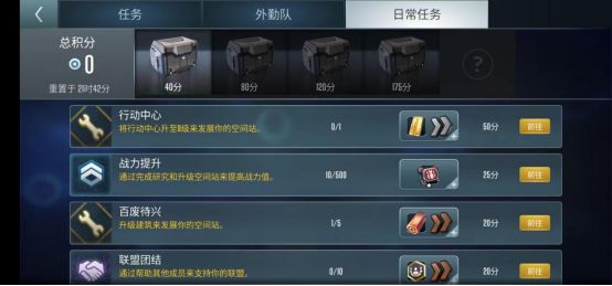 外出任务考虑到航行时间,收益并不是非常划算,参加游戏活动,完成【目标中心】和【福利】界面的【新手嘉年华】任务,才是收获资源的最佳渠道,同时也可根据提示引导,更快地熟悉游戏流程。