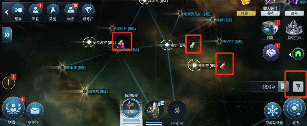游戏本身每日在线会有各个时长对应宝箱,不过给到的资源有限。想要更多开箱资源,可以选择在来回于各个星系做任务的同时,攻击各个等级的敌舰,简称“刷怪”。每个星系的红怪只要战力在你之下,都可以发起攻击,击败敌舰有概率获得超级宝箱。超级宝箱可在物品栏查看。开宝箱可得星舰升级/升阶所需资源,资源种类随机,资源质量随怪物等级而升。