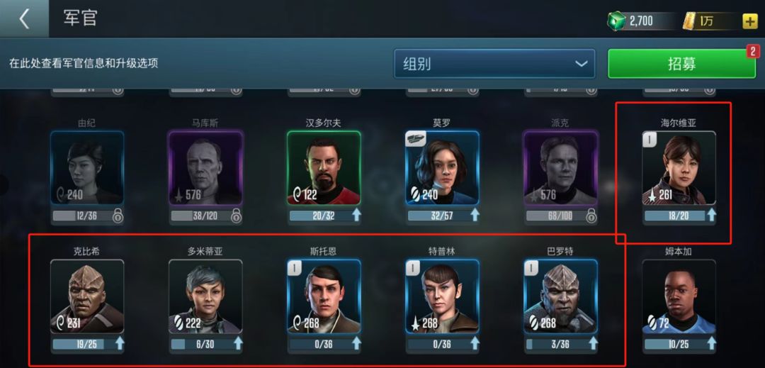 矿工组别的军官目前没有史诗级,但是游戏的策略重点不在稀有度上,而在具体的军官技能上。前往【军官】页面,在分类选择【组别】,下拉列表,可以看到从海尔维亚到巴罗特六位军官都属于测量员和矿工分组,信息页面右侧的特殊技能也都与采矿有关。