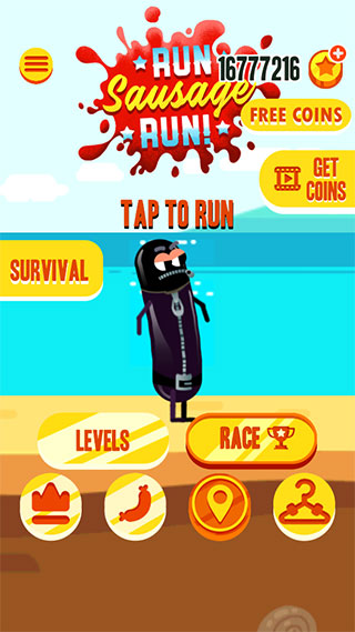 2、底部分别是成就选项、香肠种类,背景地点以及香肠皮肤,点击屏幕即可开始第一关游戏。