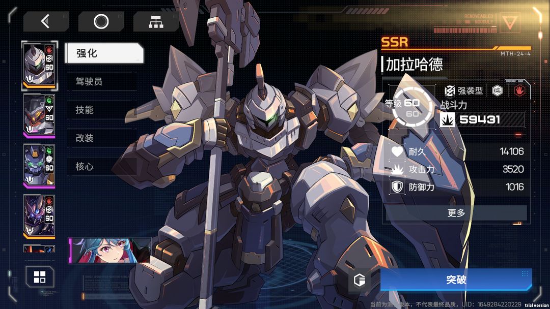 这里显示了各项基本数据,即血量,攻击,防御,以及不是那么重要,但还是有必要介绍一下的机体类型与机甲特性