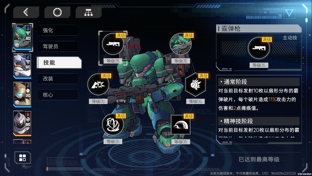 泛用型:基础技能通常是1格斗+1射击,如同描所示,是较为均衡的类别,且测试版本所有的泛用型机体,机甲特性均为团队充能,可以说,不管哪种关卡都可以用,这就是团队充电宝带来的自信