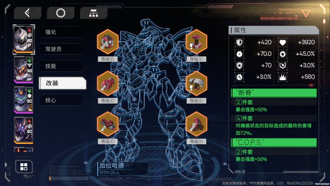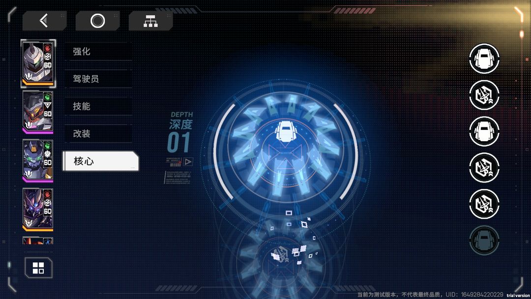 如图所示,在2/4/5三个档位时,核心强化的是机体的三维数值,而在1/3/6三个档位,核心强化的,则是机体的机制