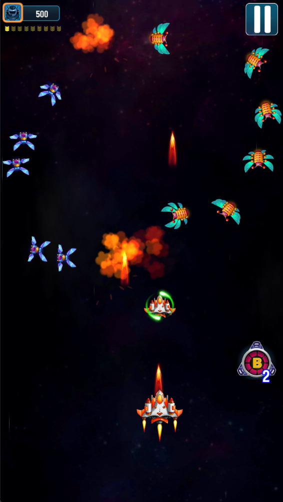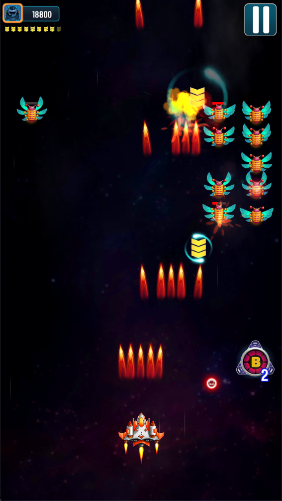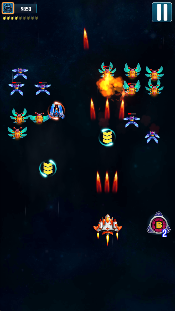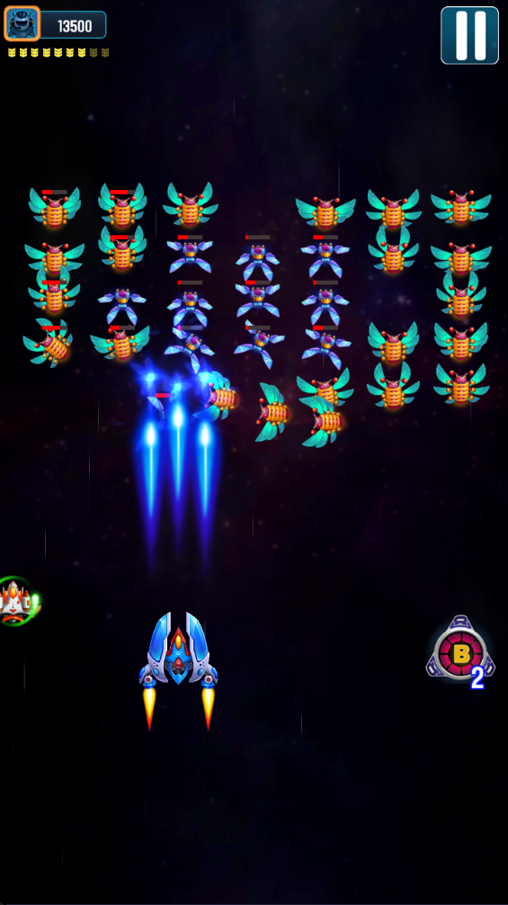玩家控制一艘宇宙战机,通常位于屏幕的底部。