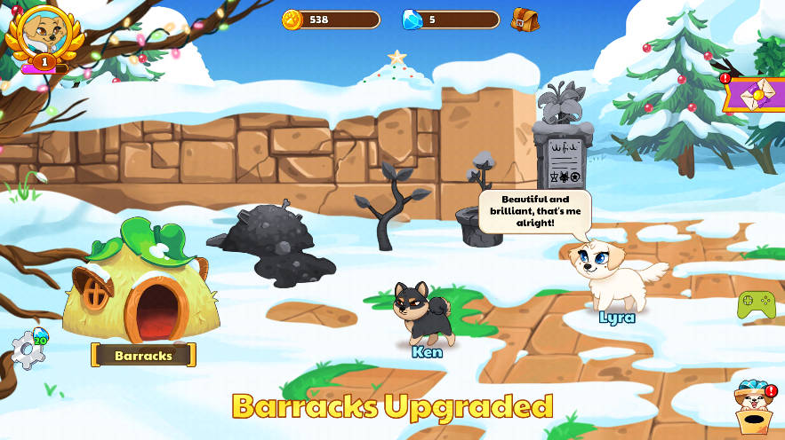1、在派遣英雄参加战斗后,回到游戏即可收集奖励,利用这些资源通过制作系统为英雄升级,同时收集更多独特的史诗级狗狗。
