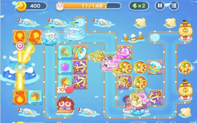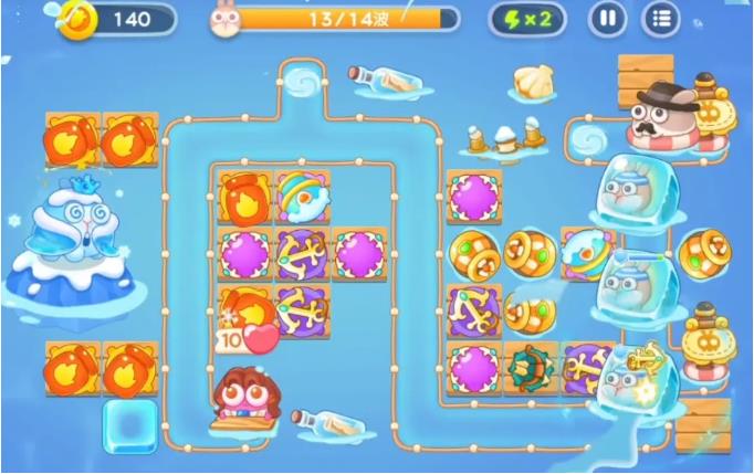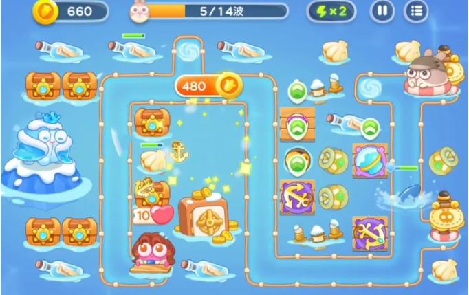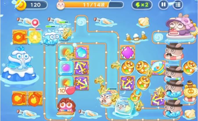 先建个船锚和水雷,没有水雷船锚打不了水下的兔子。乱飞的船锚能清理周边的建筑物,没有兔子时就打建筑物,出兔子时就先清理兔子。尽早在出口上个减速的炮塔,防治突然蹿出来了跑的快的兔子。前面4关,基本上就是水上水下怪物穿插的出现,减速、破甲、打掉即可。