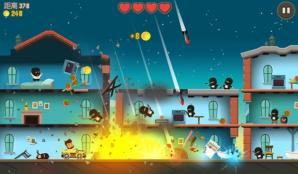 敌人有枪手、投弹手、火箭筒手和胖子队长,枪手是标配,如果有好多人,同样很危险。投弹手可以扔出燃烧弹,可以在一定区域形成火海,角色一旦进入,就可以造成持续伤害;火箭筒手可以攻击上方经过的车辆,所以需要平地撞死他们;胖子队长武器是冲锋枪,可以一次射出多发子弹,是非常危险的存在。