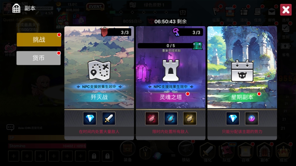 18.副本:高难关卡所在处,挑战副本可以获得稀有道具奖励。