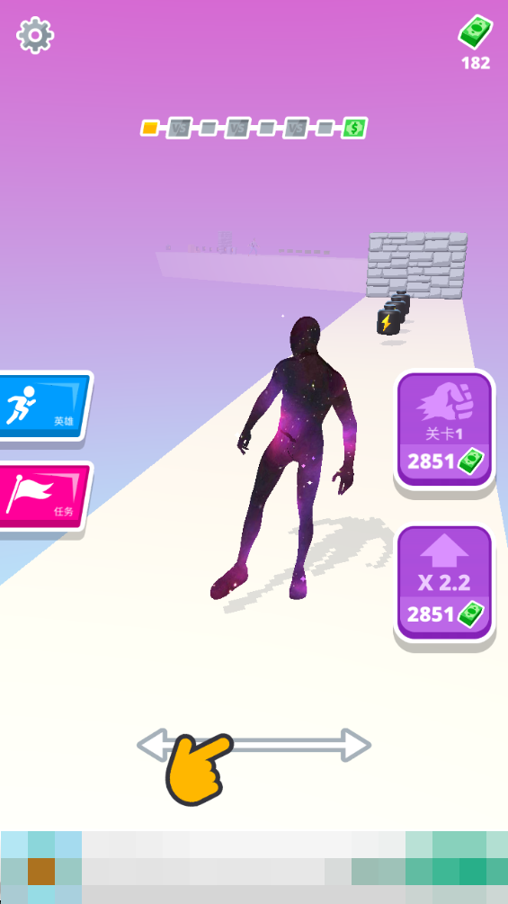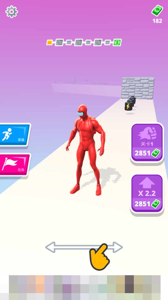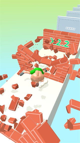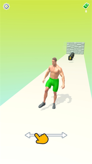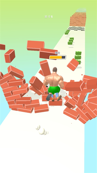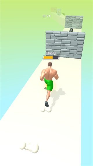 1.玩家控制肌肉人在跑步的过程中,可以通过击败对手、收集物品等方式来增大自己的肌肉,冲破砖墙。
