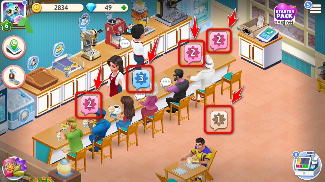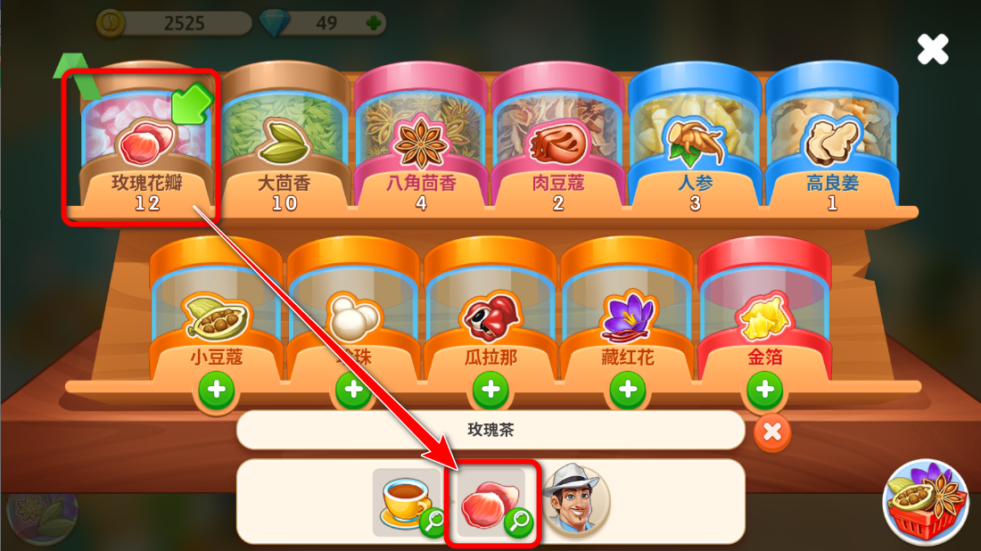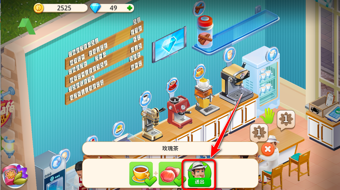 1.游戏中如果想要出售香料,必须要和咖啡一起出售,找到顾客中有这种花瓣印记的顾客,点击。
