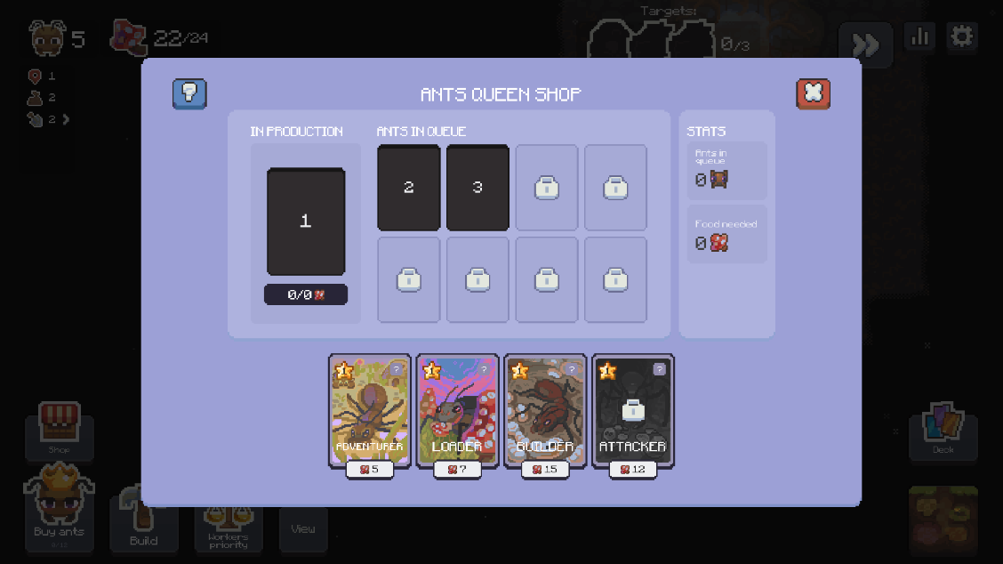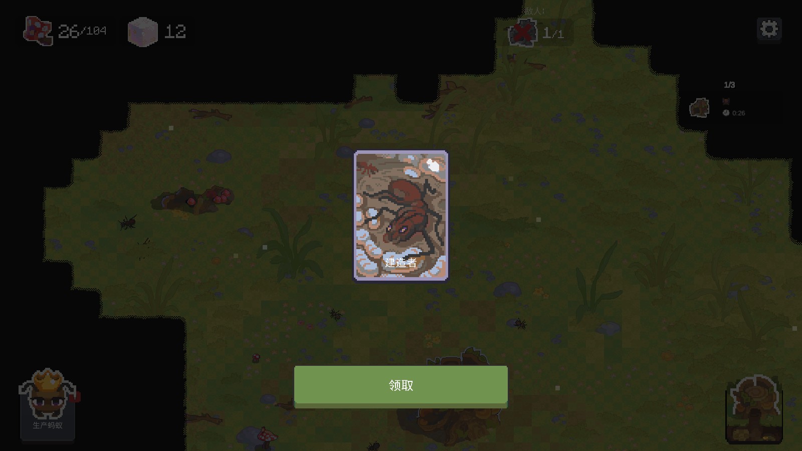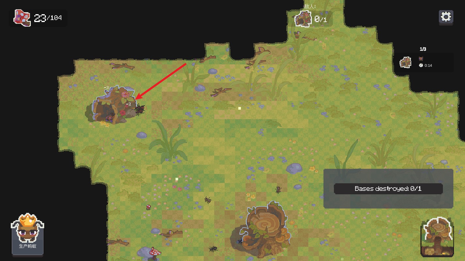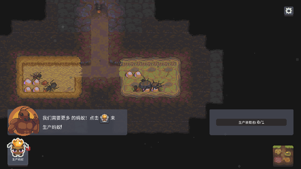 1.点击左下角的生产蚂蚁即可生成各种不同类型的蚂蚁。