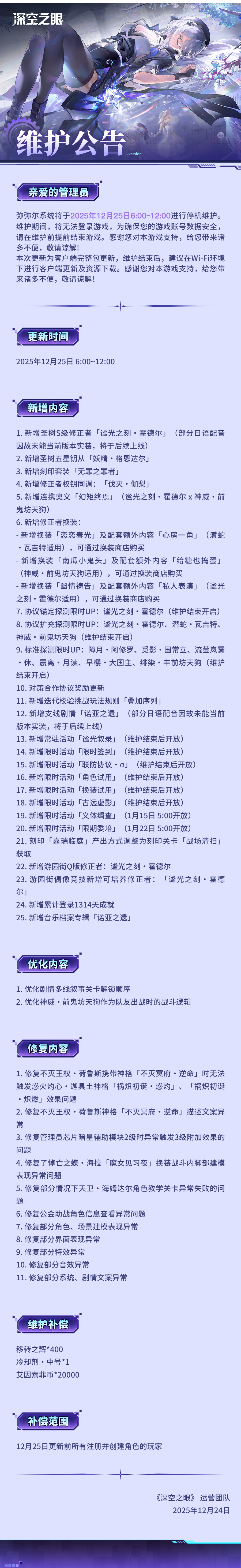 弥弥尔系统将于2025年12月25日6:00~12:00进行停机维护。维护期间,将无法登录游戏,为确保您的游戏账号数据安全,请在维护前提前结束游戏。感谢您对本游戏支持,给您带来诸多不便,敬请谅解!