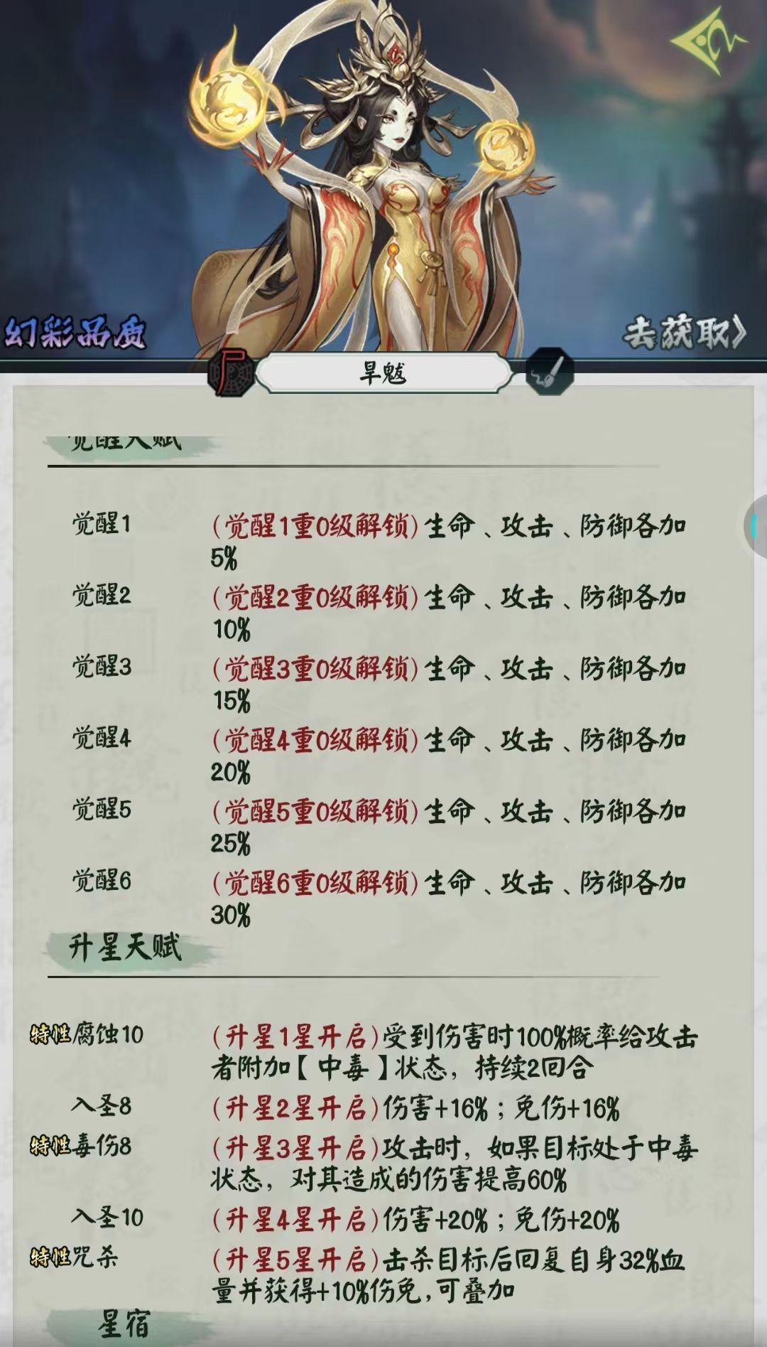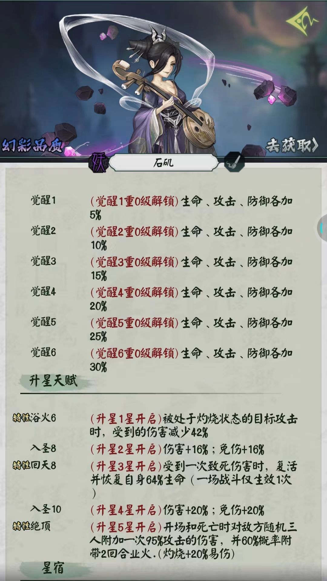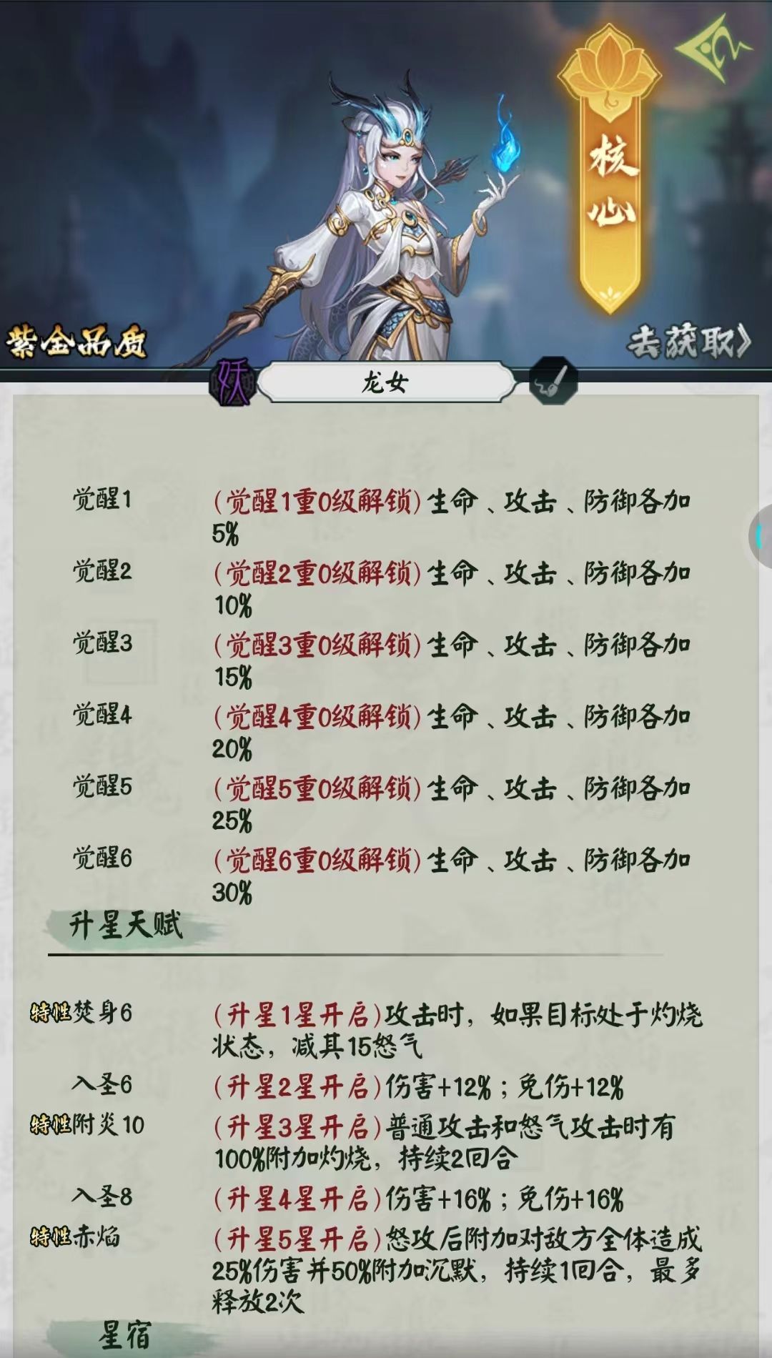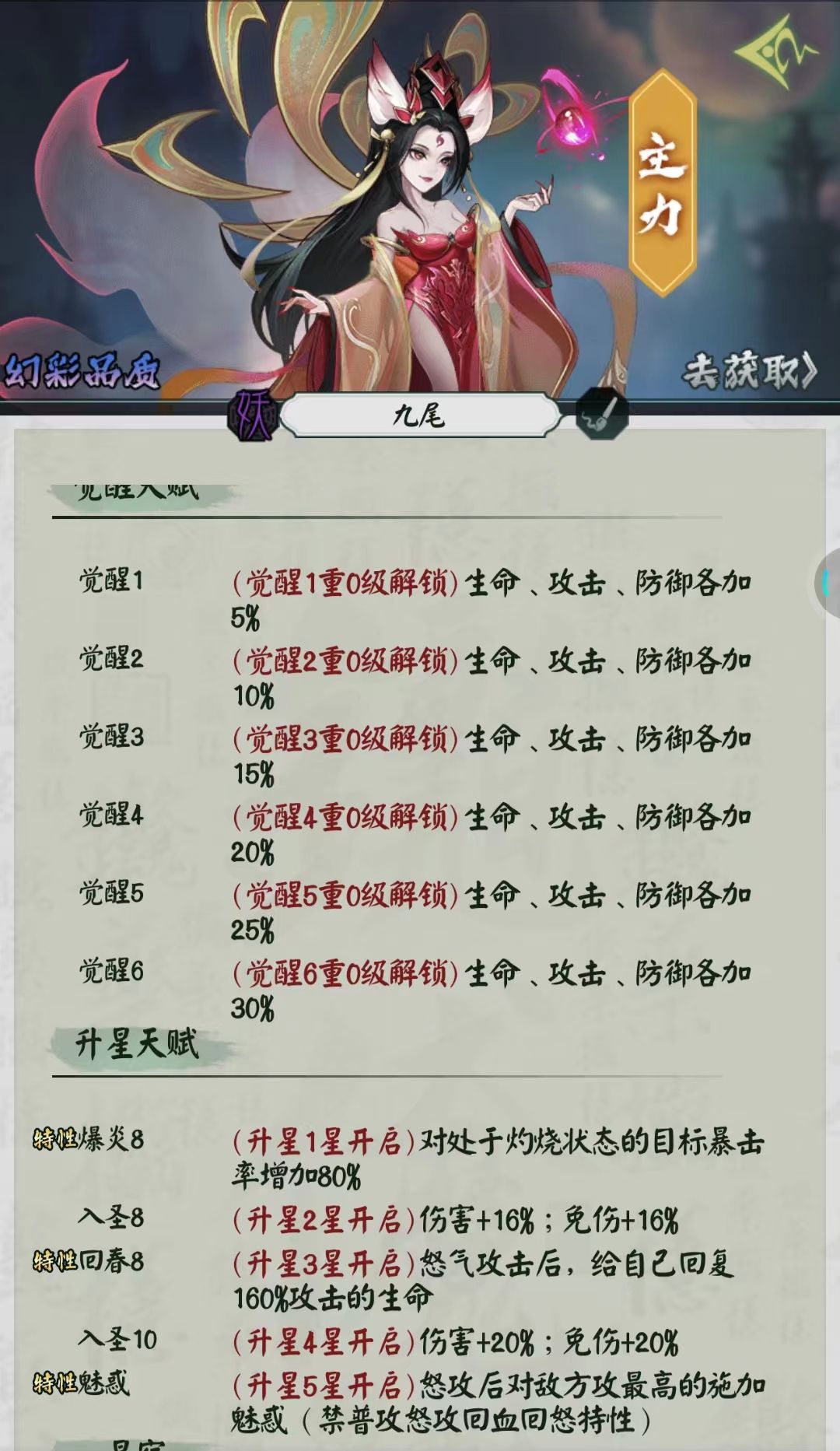 幻彩2九尾是妖族主C担当,全新改动后的九尾获得了加血神技和魅惑技能(禁普攻/怒攻/回血/回怒特性),但是她的怒攻是打两条直线4个人,基础伤害有点低所以需要想办法触发1星天赋(如下图)的暴击,她本身是没有技能挂灼烧,这个时候就需要其他魂灵的配合了,石矶或者龙女可以放在1号位先手挂上灼烧再由九尾暴击输出接上控制,幻彩宠物2兔子+灵符寒天的搭配也能极大程度上提升伤害;主九尾副石矶+龙女应该是当前版本妖族最强阵容了,白骨夫人和黑山老妖也能为阵容提供增益。